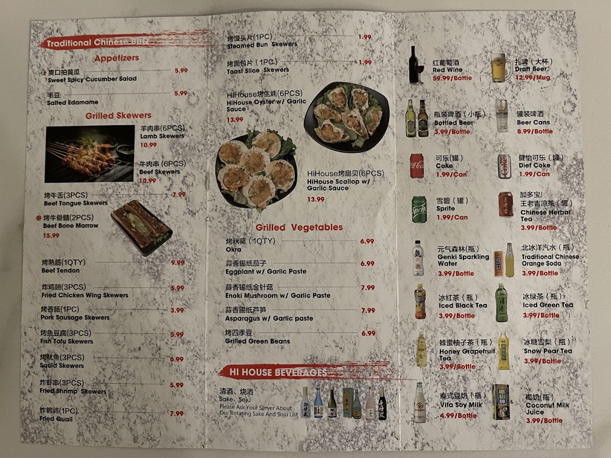 The menu at HI House Shabu Shabu & Grill features a variety of dishes primarily centered on hot pot and Chinese-style barbecue. It is organized into several categories catering to different dining preferences, including grilled skewers, noodle soups, small stir-fried dishes, and appetizers.