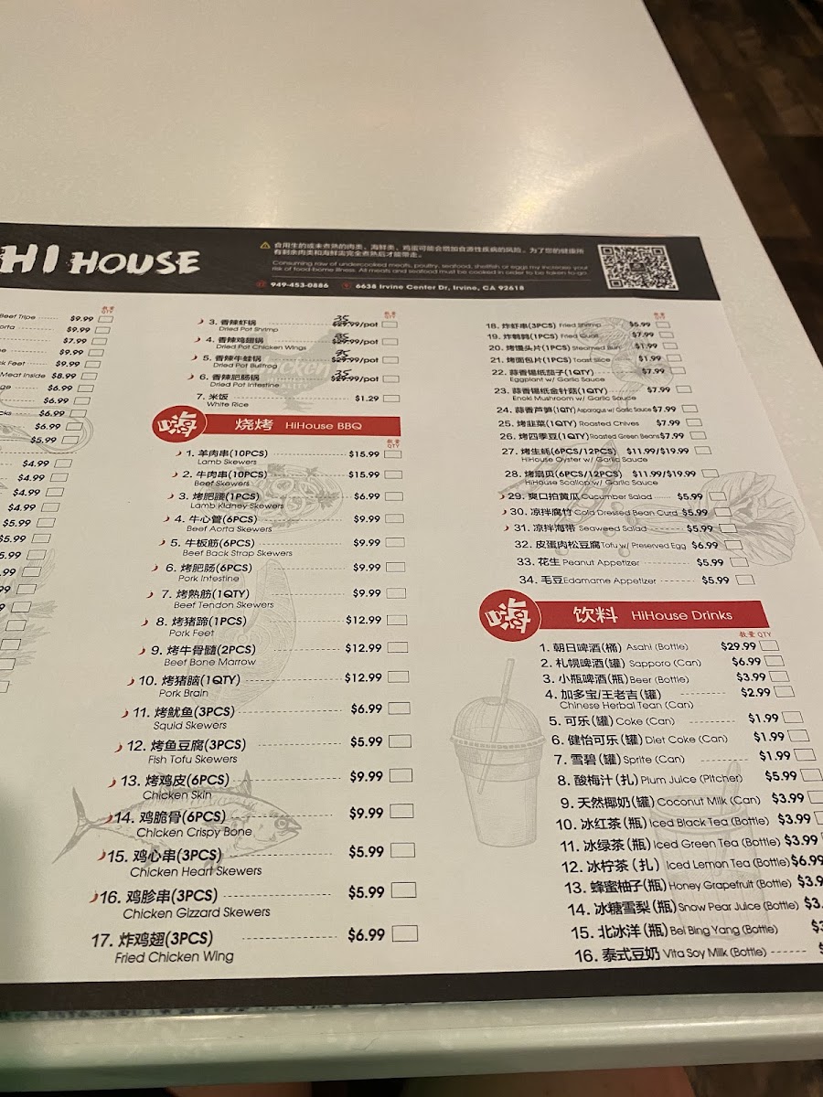 There is also a selection of HiHouse 特色小炒 (specialty small stir-fried dishes) which includes items like spicy fried clams, fried chicken bones, and fried squid. These dishes provide additional savory options to accompany the hot pot or barbecue items.